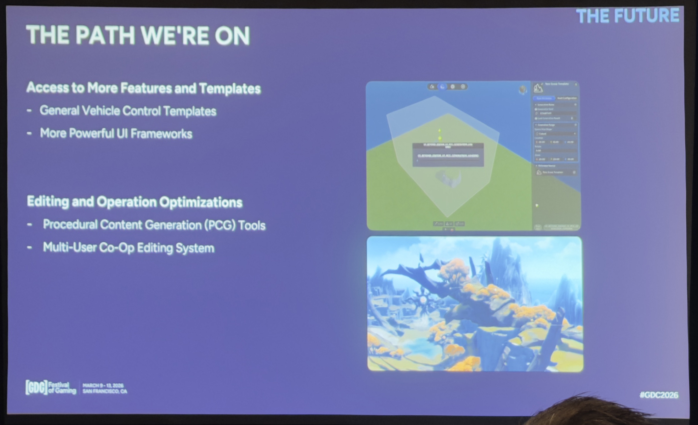 展望未来,我们的核心目标是:在不叠加复杂度和成本的前提下,持续拓展创作者的创作边界。这意味着我们会提供更多模板和更高级别的构建块以减少重复劳动,比如标准化的操控模板(如载具),以及更强大的UI框架供创作者使用。工作流方面,我们会持续投入能缩短迭代时间的工具,例如程序化生成助手、更便捷的批量操作、更清晰的调试界面。我们还在探索多用户协同编辑,因为进入多人协作领域后会有更多变数,所以我们希望平台原生支持多人协作,而不是让创作者再通过外部工具协调。