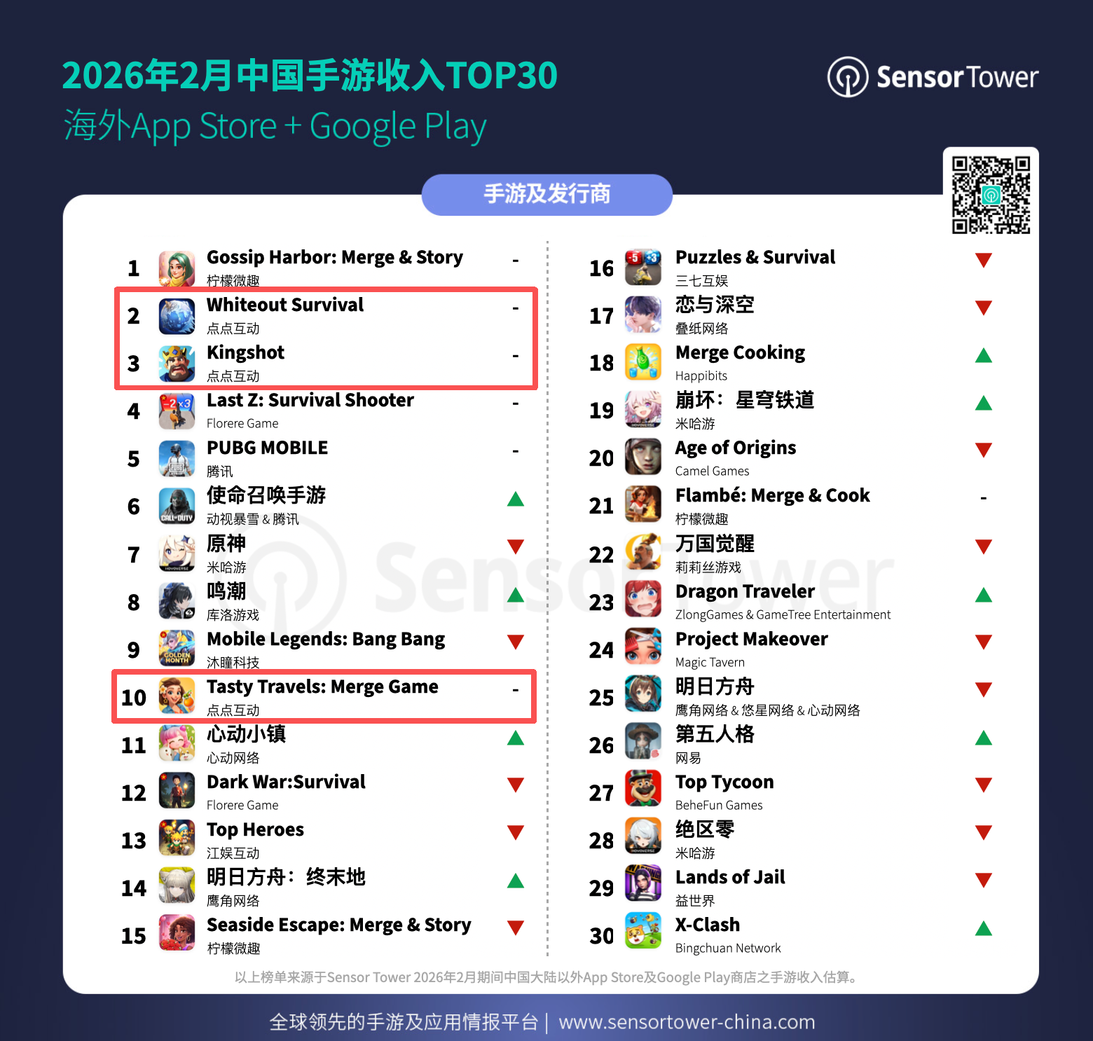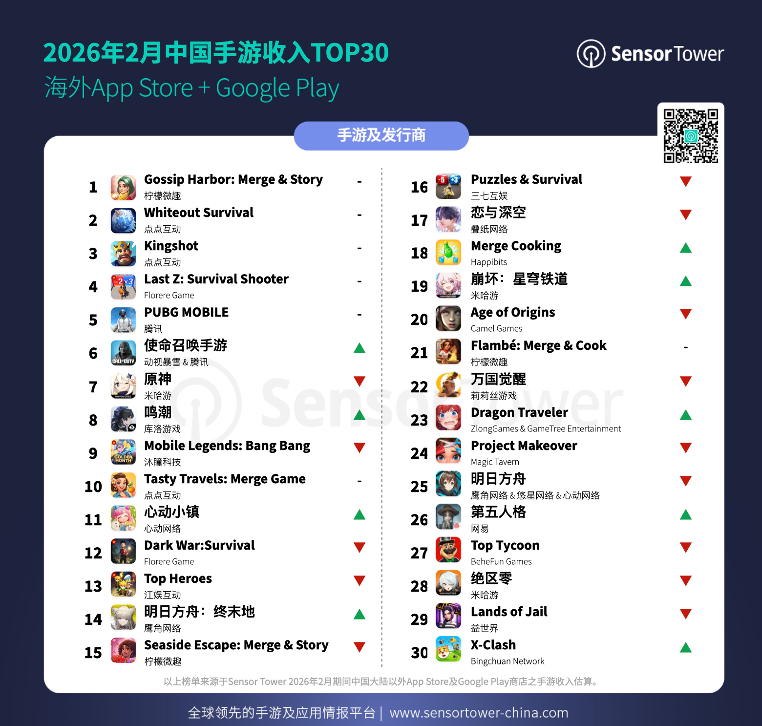 最近,Sensor Tower发布了2026年2月中国手游产品在海外市场收入排行TOP30(以下简称收入榜,仅统计应⽤商店IAP预估值,不包括⼴告变现收⼊和中国地区iOS及第三方安卓渠道收入)。
