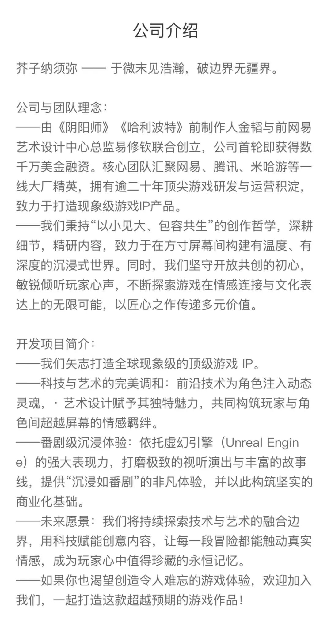 从公司介绍来看,芥子由金韬与易修钦联合创立,团队称公司首轮已获得数千万美金融资,核心成员来自网易、腾讯、米哈游等头部厂商,目标是打造“现象级游戏IP产品”。
