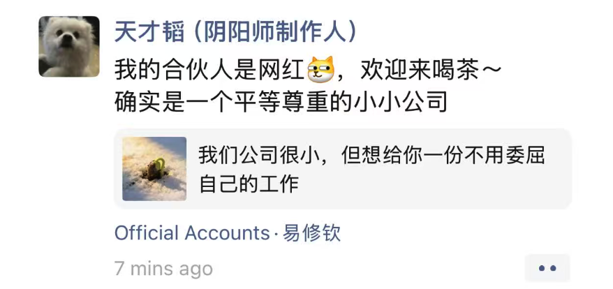 今天,易修钦发布公开招聘长文,为双方创立的新公司“芥子”招募人才。相比常规招聘启事,这篇文章并未重点强调薪资福利或岗位门槛,而是用了大量篇幅阐述团队希望建立的工作方式与创作环境。易修钦在文中提到,自己并不认同把人当作“大厂螺丝钉”的工作状态,也强调好的作品应该诞生于平等、尊重、自由且有温度的环境,而不是被KPI、PUA和层层流程不断消耗的体系。