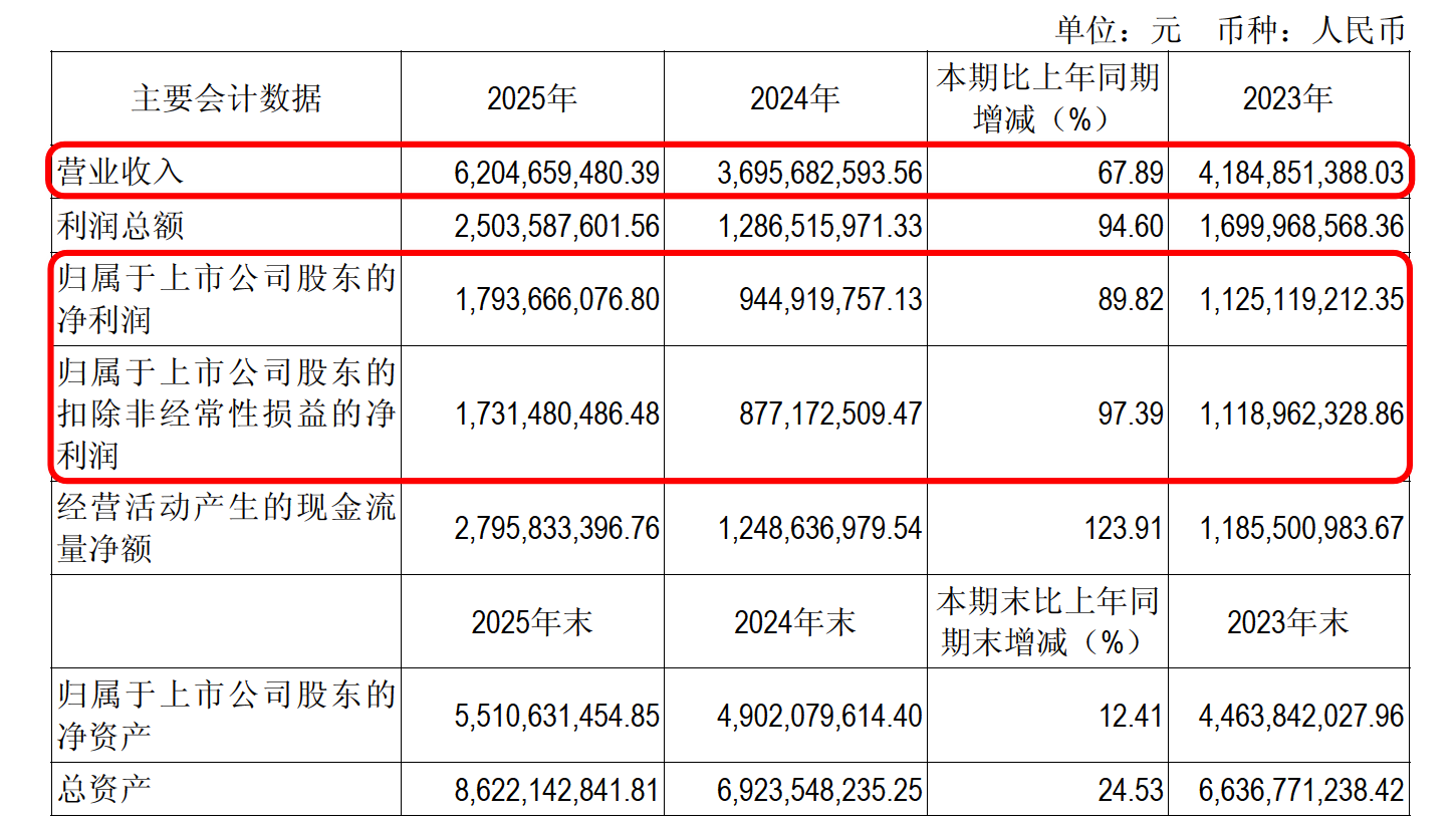 报告显示,公司在去年的营业收入达到62.04亿元(人民币,下同);其中归属于上市公司股东的净利润17.93亿元,同比去年增加了8.49亿元,增长幅度达89.92%;而扣除非经常性损益的净利润为17.31亿元,同比增长97.39%。