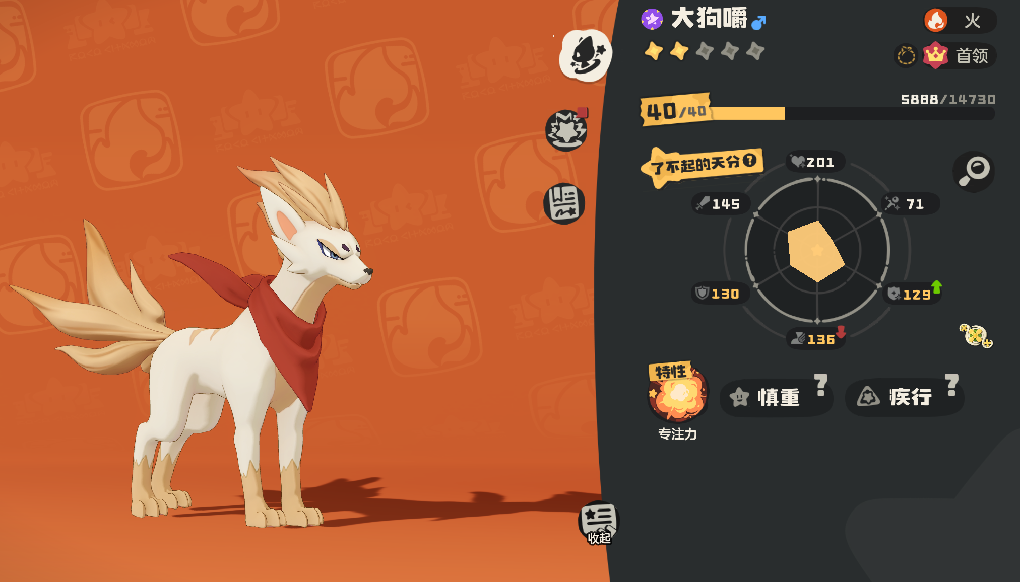 只有这样才能使得游戏中的精灵一眼看上不至于让人眼花缭乱,同时又有着一个足够鲜明的核心记忆点,比如游戏中早期就能捉到的“护主犬”,它火焰形状的毛发和脖子上一直有的红围巾,就只是这样看上去略显“单调”的搭配,但却足以让人一眼看出其功能特性,在视觉和心理上形成双重记忆点。
