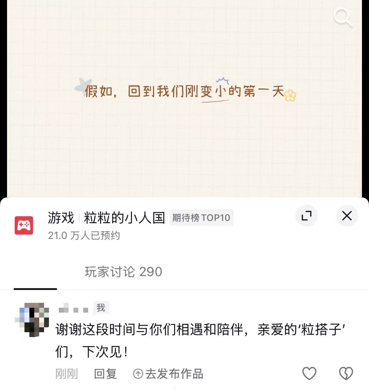 3月30日上午,《粒粒的小人国》(下称 粒粒)安家测试以TapTap9.6的评分圆满结束,服务器随之关闭。也是这天,有他们的玩家故事上我的社媒首页。