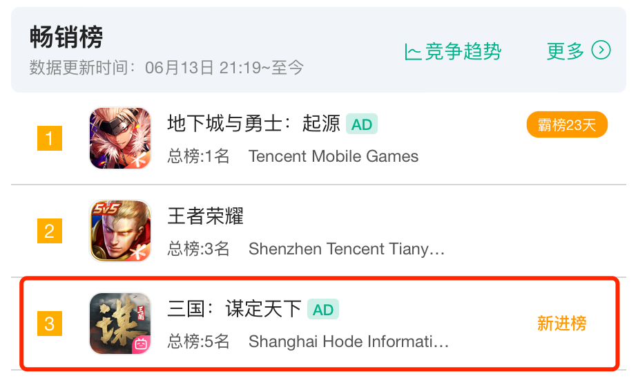 (《三国:谋定天下》公测当天的iOS畅销榜成绩)