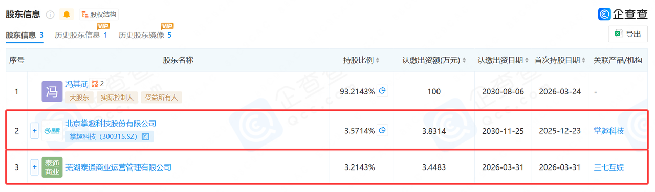 该公司成立于2025年8月8日,主研方向为手游SLG。据悉,多巴幻境在2025年12月先一步获得了掌趣科技的投资,现持股占比约3.57%。