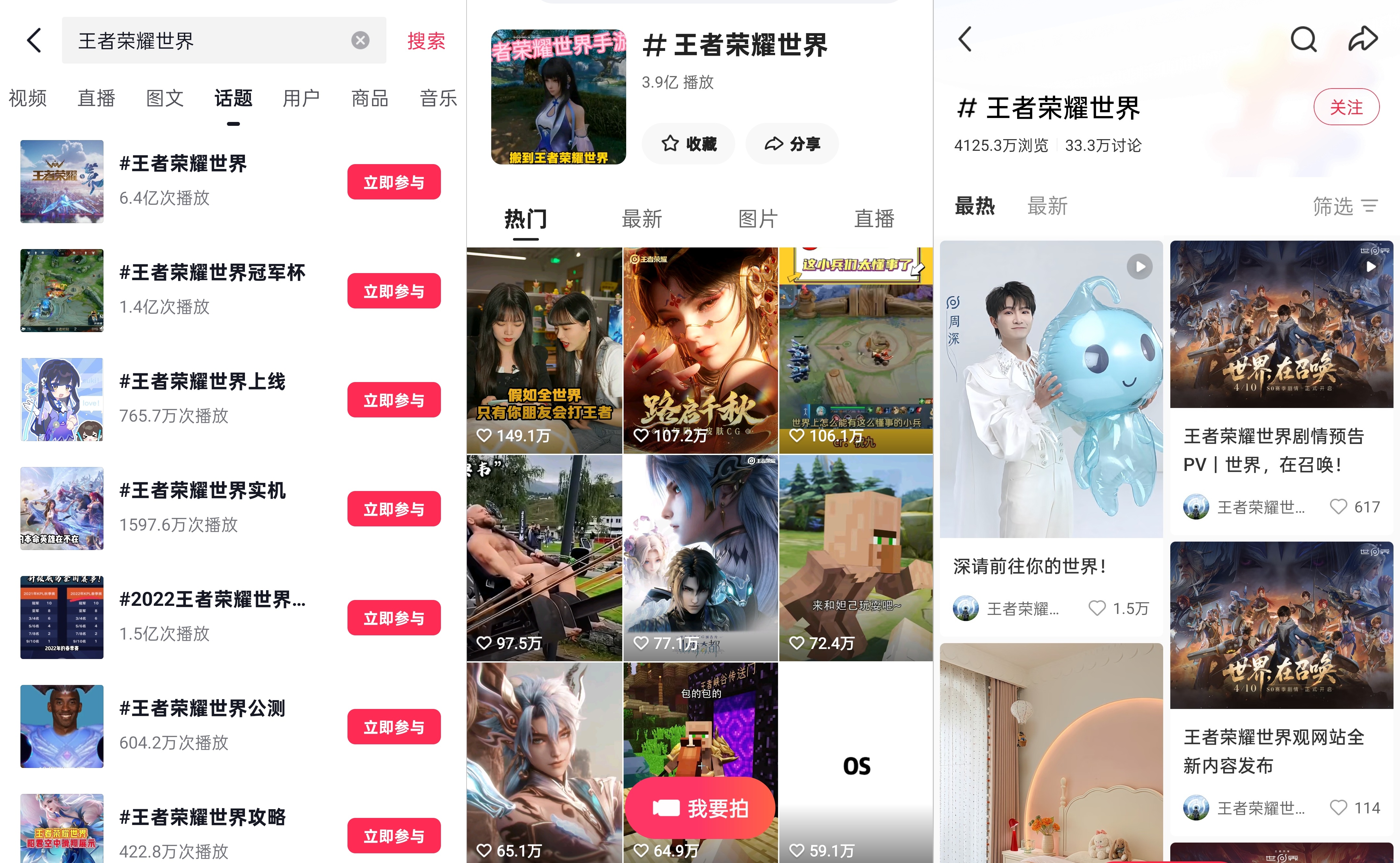好在,《王者荣耀世界》的首发表现完全不输同类型的头部新品。截至目前游戏在抖音、快手、小红书等平台已吸引超千万玩家关注,多个相关话题的讨论度也迅速攀升至亿级;