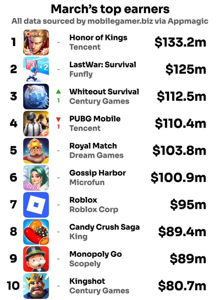 最近,外媒Mobilegamer.biz发布了2026年3月的全球手游收入榜。(注:数据来源AppMagic,统计范围不包括第三方安卓渠道、网页商店及广告收入,且已扣除平台分成)