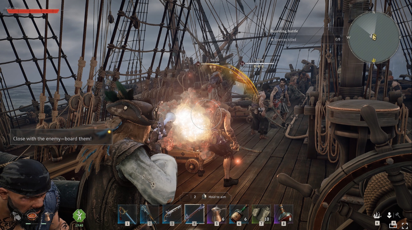 提到装备,就不得不说到游戏的武器系统。数量虽算不上丰富,但每一款都极其贴合海盗背景。冷兵器方面,军刀拥有攻速与伤害,适合近身缠斗;细剑灵活飘逸,兼具实用与美观;长戟范围广阔,面对群体敌人时具备优势;热武器则有手枪、滑膛枪加持,提供远距离爆发伤害,完美还原了海盗时代“冷热结合”的战斗场景,让每一场厮杀都更具代入感。