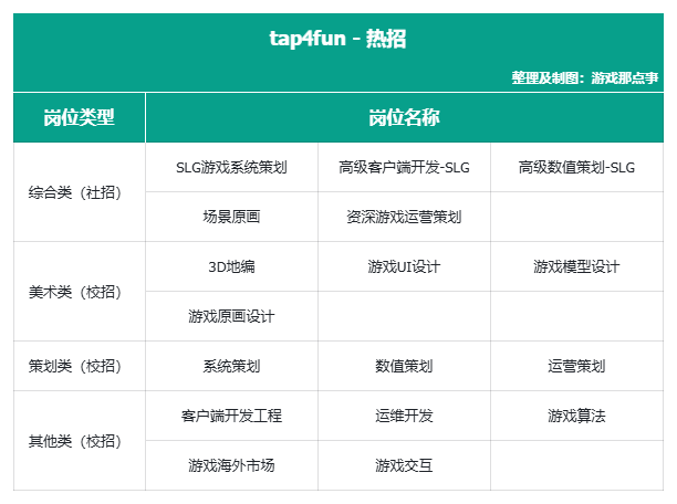 tap4fun代表作《战地风暴》《胜利之吻》《猿族计划》等,覆盖SLG战争与模拟。热招岗位涵盖策划、美术及技术方向,岗位类型多样,偏重策划与研发核心岗位。
