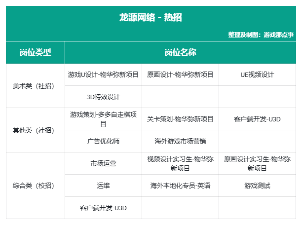 龙源网络代表作《神都夜行录》《轩辕剑龙舞云山》等,覆盖国风RPG与卡牌。热招岗位涵盖美术、策划、技术及运营方向,岗位类型多样,偏重美术与研发岗位。