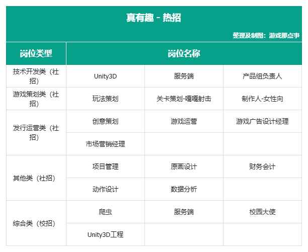 真有趣代表作《不休的乌拉拉》《香肠派对》等,覆盖放置休闲与TPS。热招岗位涵盖技术、策划、运营及综合方向,岗位类型多样,偏重研发与运营岗位。