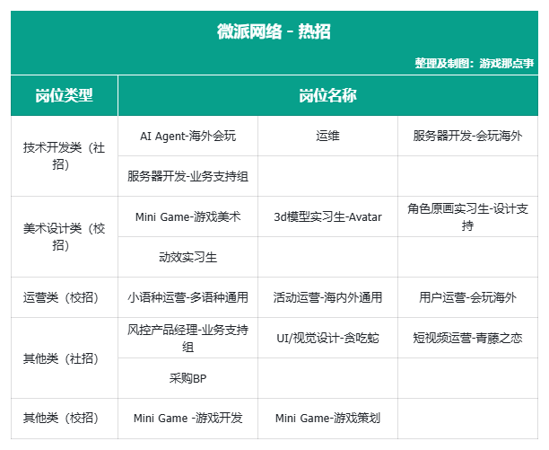 微派网络代表作《贪吃蛇大作战》《会玩》等,覆盖IO竞技与社交平台。热招岗位涵盖技术、美术、运营及其他方向,岗位类型多样,偏重运营与技术岗位。