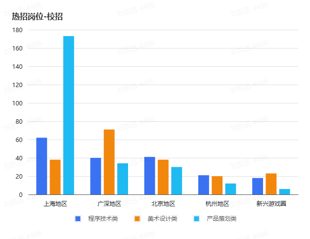 而杭州与新兴游戏圈热招总量相对较小(210、390个)。但校招比例偏高,可见企业在这些区域的人才孵化布局,兼顾未来增长潜力。