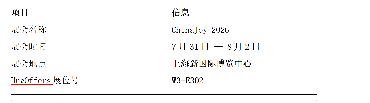 凡在ChinaJoy 2026期间莅临HugOffers展位W3-E302的朋友,均可享受:
