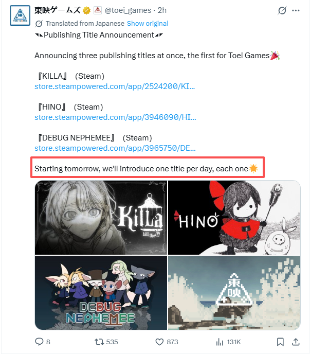 此外,东映游戏还在其X账号上表示,未来将启动“每日一游”的公布节奏,这意味着接下来还会有更多合作工作室与项目陆续亮相。至于这个活动会持续多久,目前则尚未明确。