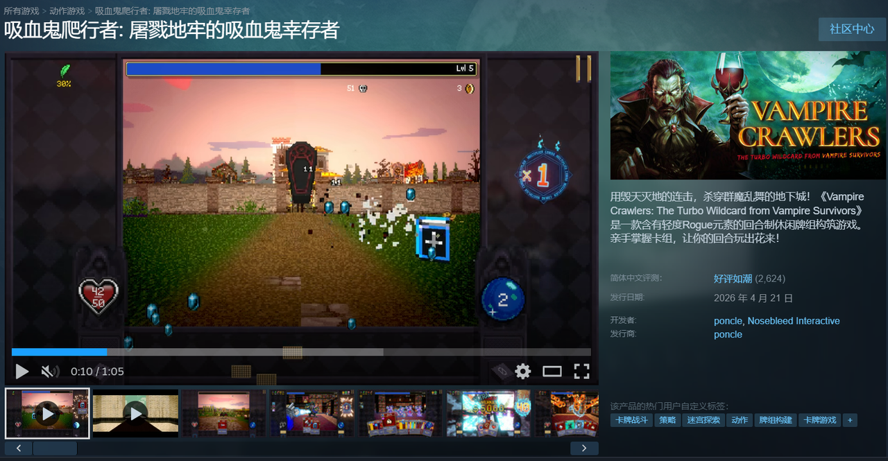 上个月,我们曾介绍过《Vampire Crawlers: The Turbo Wildcard from Vampire Survivors》——这款名字长得有点任性的游戏,中文译作《吸血鬼爬行者:屠戮地牢的吸血鬼幸存者》(下文简称《吸血鬼爬行者》)。