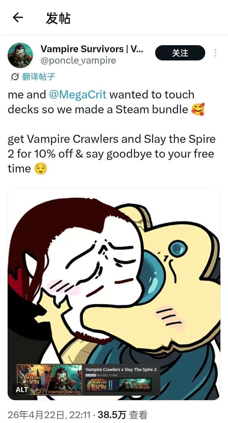 当然,这并不意味着《杀戮尖塔2》被《吸血鬼爬行者》完爆,更不是说后者的玩家全都来自前者。事实上,两款游戏在体量与定位上仍有明显差距。而这次《吸血鬼爬行者》恰巧撞上一个情绪窗口,承接了《杀戮尖塔2》争议更新所溢出的玩家注意力,从而获得了一波意料之外的热度。