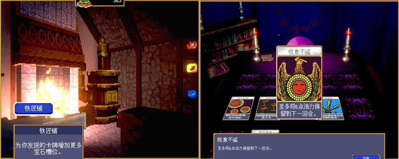 《吸血鬼爬行者》在Demo阶段,就展现出了酒馆和属性升级这些能让玩家在局外成长的玩法。到了正式版,又额外增加了铁匠铺和秘能这两个功能。铁匠铺的作用是让卡牌能携带更多宝石加成,秘能则能让玩家每局游戏携带一个强力效果,这两个功能都进一步丰富了玩家的局外成长体验。