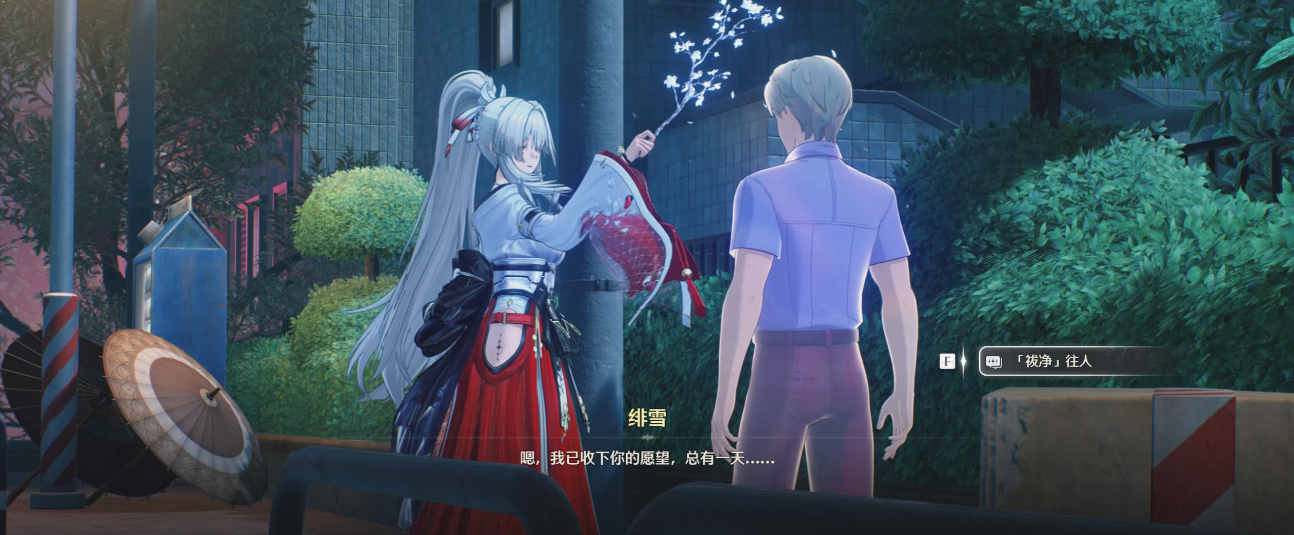 绯雪这条暗线的穿插时机主要有三处。第一处为3.3剧情最开始的幕间“愿系铃中”,玩家操控的便是与校长约定相见的绯雪。她以灼樱巫女的身份重回穗波市,祓净那些怀揣执念的“往人”。